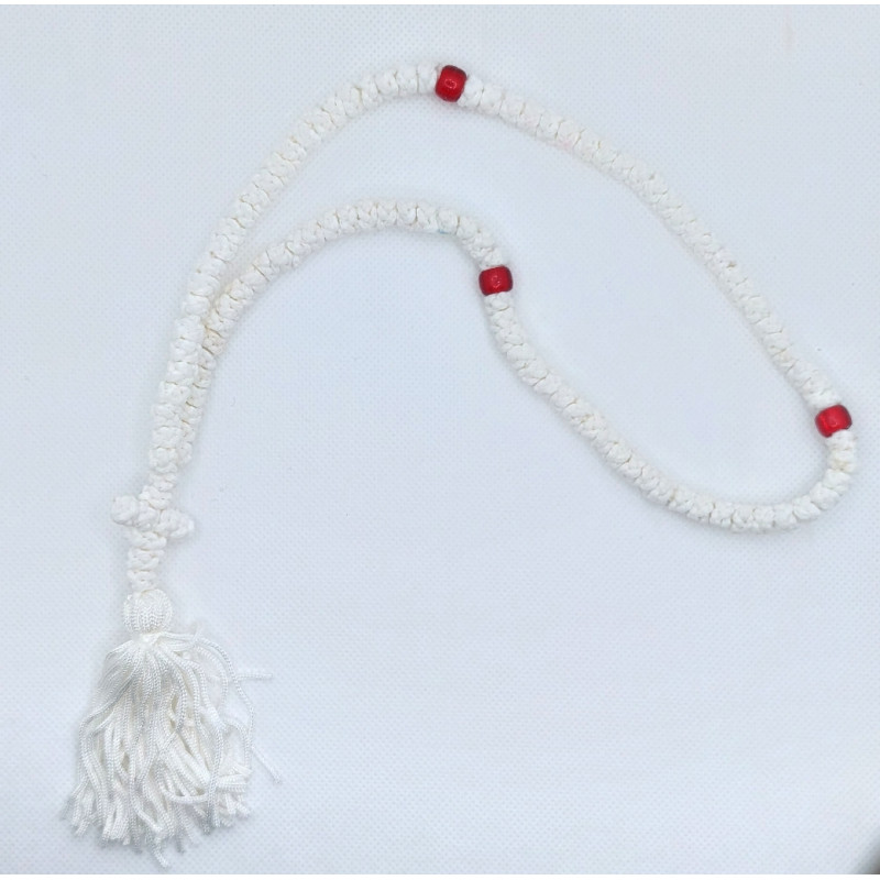 Ponořte se do modlitby a meditace s těmito pravoslavnými bílými čotkami s červeným korálkem, ručně vyrobenými v řeckých monastýrech. Každý z 100 uzlů je pečlivě vytvořen z vysoce kvalitního šňůroví a zdůrazněný jednotlivým červeným korálkem, připomínajícím kapku Kristovy krve a jeho oběť za nás. Tento světlý nástroj k modlitbě přináší mír a koncentraci do vašich duchovních praktik. Ačkoli se zobrazený obrázek může lišit od skutečného produktu, každá šňůra je vyrobena s osobním závazkem a představuje unikátní duchovní spojení.