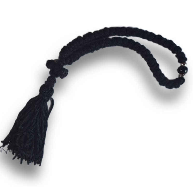 Tyto drobné čotky, pečlivě spletené z kvalitní bavlněné příze, mají 50 pevných uzlů a délku 21 cm. Jsou zdobeny jemným korálkem, který slouží jako orientační bod při modlitbě. Tradiční střapec a tmavé provedení dodávají čotkám vzhled pokory a vnitřní soustředěnosti.