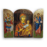 Tento působivý triptych "Svatá Rodina a ochranní Archandělé" je vzácným artefaktem, který v sobě snoubí historickou ikonografii s hlubokou duchovností. Každá panel nese vyobrazení naplněné symbolikou: ve středu je umístěna Panna Maria držící Ježíška, symbolem nekonečné lásky a ochrany, po jejích stranách jsou Archanděl Gabriel, posel nebeských zpráv, a Archanděl Michael, ochránce a bojovník proti zlu. Triptych byl vytvořen v Řecku a vyniká precizním zpracováním na dřevěném podkladu s pozlacenými detaily, které dodávají ikonám noblesní a majestátní vzhled. Rozměry triptychu jsou 20x14 cm, což z něj činí ideální duchovní doplněk pro domácí oltář nebo kostelní prostor.