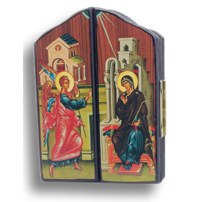 Představujeme triptych "Panna Maria s Dítětem", vznešený výraz pravoslavného náboženského umění, vyrobený v Řecku. Tento 20 x 14 cm dřevěný artefakt nabízí na centrálním panelu láskyplné vyobrazení Panny Marie s Ježíšem, flankované ikonami archandělů Michaela a Gabriela na postranních panelech. Na přední straně je zachyceno Zvěstování Panny Marie, což dává celému triptychu hluboký duchovní rozměr.