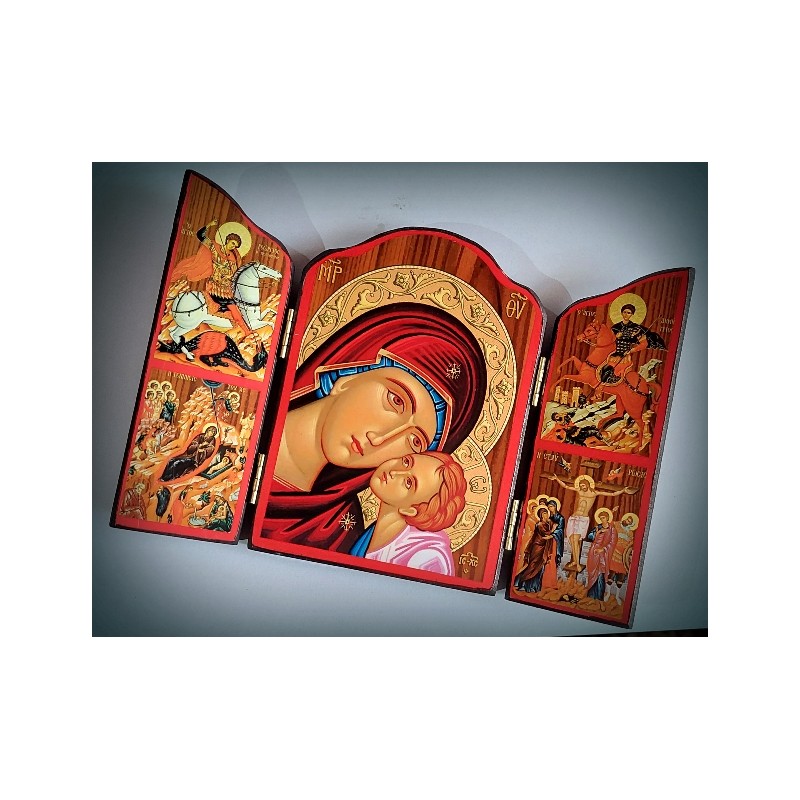 Triptych (z řec. τρίπτυχον, trojitý) je označení pro umělecké dílo rozdělené na tři části. Na ikoně je Panna Maria s malým Ježíšem. Po levé straně ikona Narození Páně a sv. Jiří. Na pravé straně ukřižování Krista a sv. Demetrios. Na přední straně Zvěstování Panny Marie.
