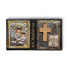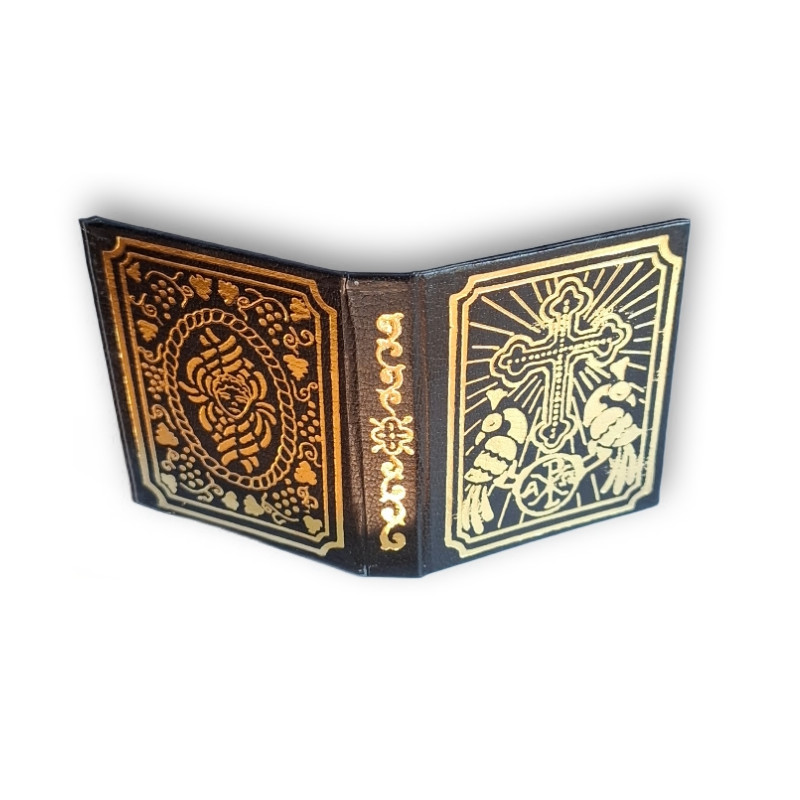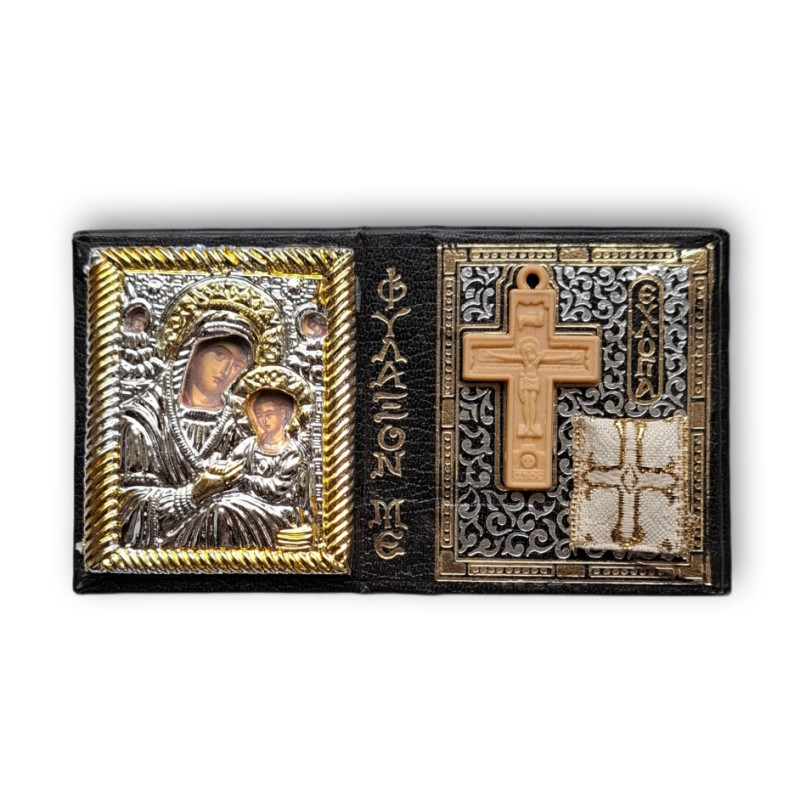 Na levé straně najdete malý umělohmotný kříž a ochranný filakton – ručně vyšívanou kapsičku, v níž se ukrývá požehnání: kousky posvěcené látky napuštěné olejem, s kapkou myrhy a kadidla. Tento posvátný dar víry přináší do srdce pokoj a posilu duchovního života.