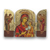 Tento elegantní pozlacený řecký triptych zobrazuje ikonu Matky Boží Hodegetria, která ukazuje cestu – Panna Maria drží malého Ježíše Krista, jenž žehná světu. Na bočních křídlech jsou znázorněni archandělé Michael a Gabriel, v modlitební pozici, symbolizující ochranu a vedení. Pozlacený podklad dodává celé ikoně zářivý a vznešený vzhled, který zvýrazňuje detailní zpracování. Triptych je vyroben z kvalitního dřeva a jeho kompaktní rozměry 7,5 x 5 cm jej činí ideálním pro domácí modlitební koutek nebo jako duchovní dárek.