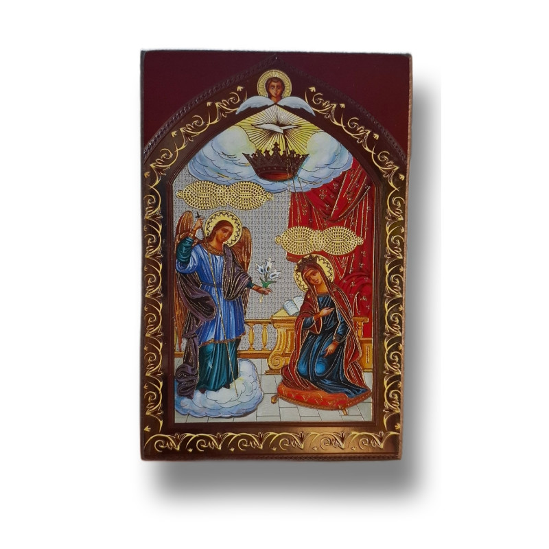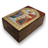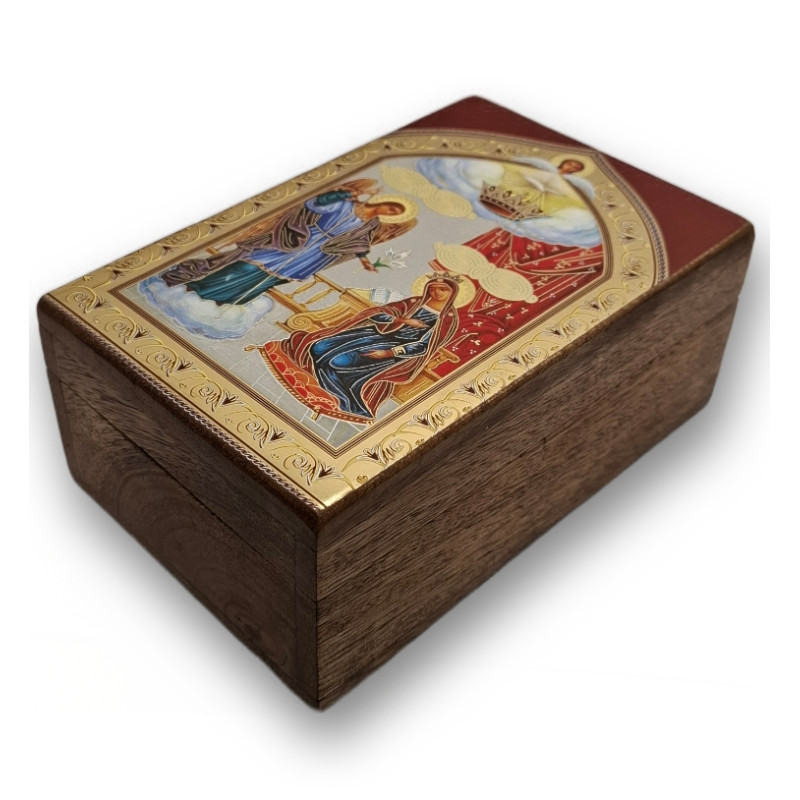 Nádherná dřevěná krabička zdobená ikonou Zvěstování Panny Marie, která přináší duchovní hloubku a eleganci. Ikona je detailně vyobrazena na pevném víku, což dává celé krabičce jedinečný vzhled. Tento předmět o rozměrech 10x15x6 cm je ideální pro uchovávání růžence, šperků, kadidla nebo jiných cenností. Vyrobeno v Řecku, s důrazem na tradiční pravoslavnou estetiku. Ideální dárek pro ty, kdo hledají krásný a duchovně významný doplněk.