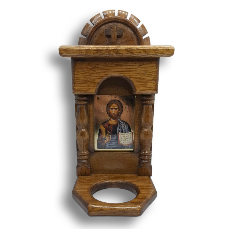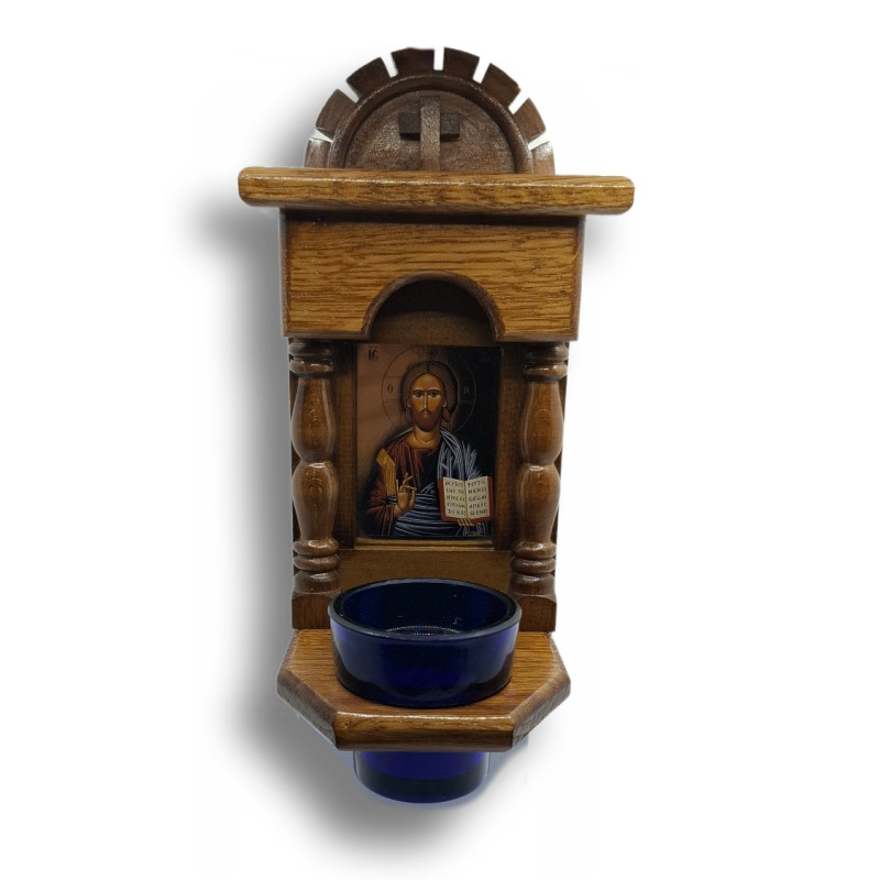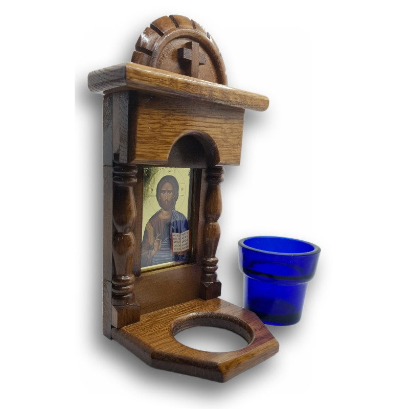 Součástí ikonostasu je skleněný pohárek určený pro olejovou svíčku. Plamínek, který v něm zapálíte, není jen světlem – je modlitbou, je tichým hlasem duše, která hledá Boha. Je symbolem naděje, víry a neustálé Boží přítomnosti v našem životě. Když hoří, připomíná, že Kristus je světlem, které osvěcuje každou temnotu.