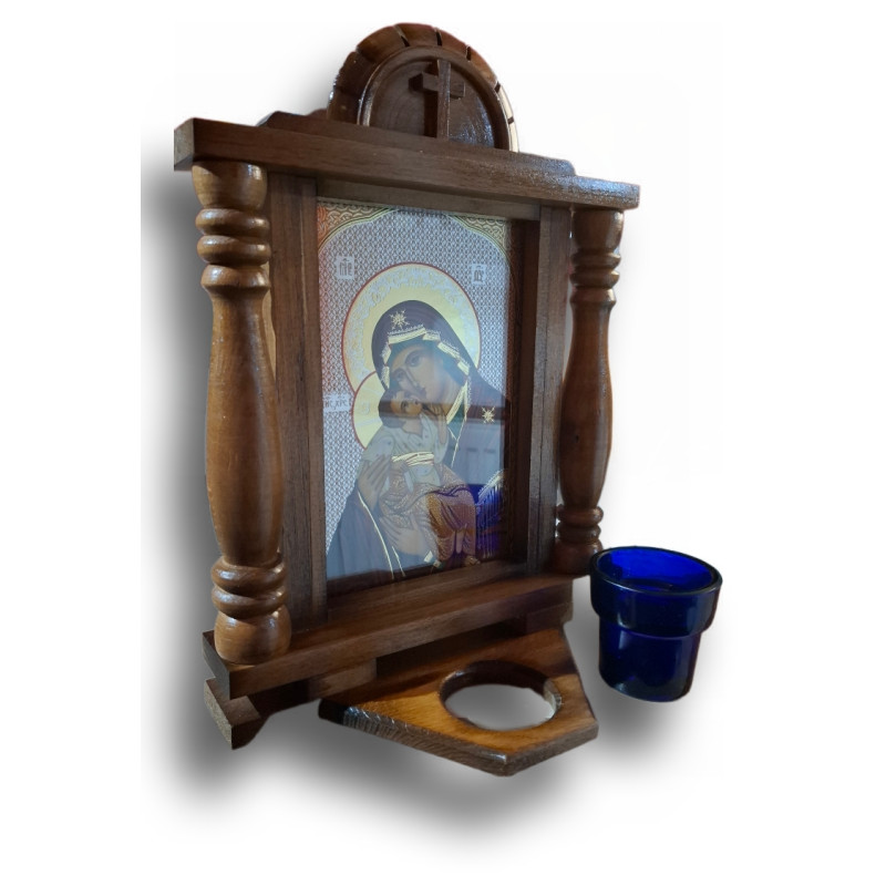 Rám ikony, vyřezávaný z masivního dřeva, připomíná chrám – malý svatostánek, který si můžete zavěsit do svého domova. V dolní části je umístěn skleněný pohárek na olej nebo svíčku. Když zapálíte plamen, rozzáří se obraz jemným světlem a celý kout se promění v místo usebrání, naděje a tiché modlitby.