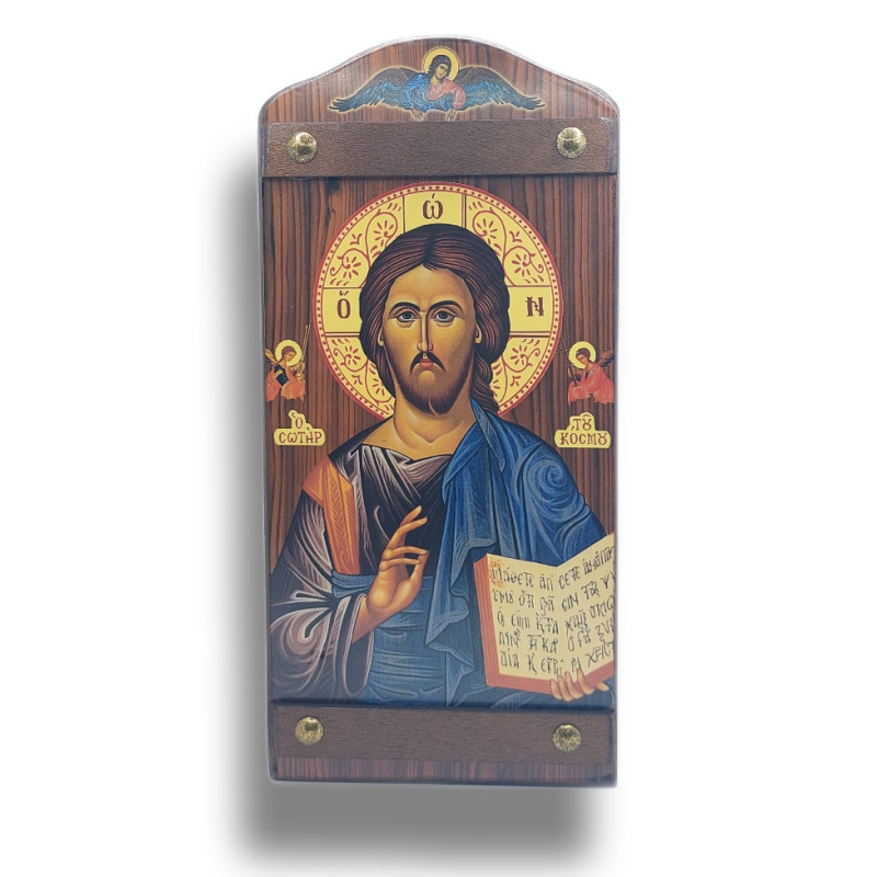 V hlubinách řeckého duchovního umění se rodí tato působivá ikona Žehnající Ježíš Vševládce. Velikostí 29x14 cm a pevně osazená na dřevěném podkladě, tato ikona představuje Ježíše Krista jako univerzálního vládce a prostředníka mezi Bohem a lidstvem. Detailně propracovaná a zdobená dvěma elegantními lištami, jak nad, tak i pod obrazem, je doplněna o anděla na vrcholu, který dohlíží na celkovou scénu. Tato ikona není jen nádherným dílem umění, ale také duchovním pokladem, přinášejícím hlubokou symboliku do vašeho domova.