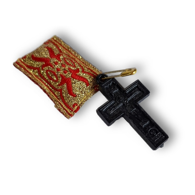Tradiční řecký amulet Filakto z ostrova Tinos doplněný černým umělým křížem. Ručně vyšívaný přívěsek poskytuje duchovní ochranu, víru a požehnání.