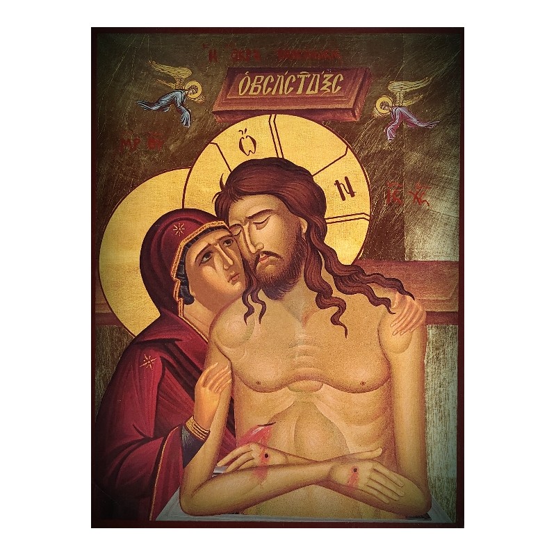 Na ikoně je Kristus, muž bolesti, který bere hříchy světa a Panna Maria, která svého syna tiše utěšuje.
