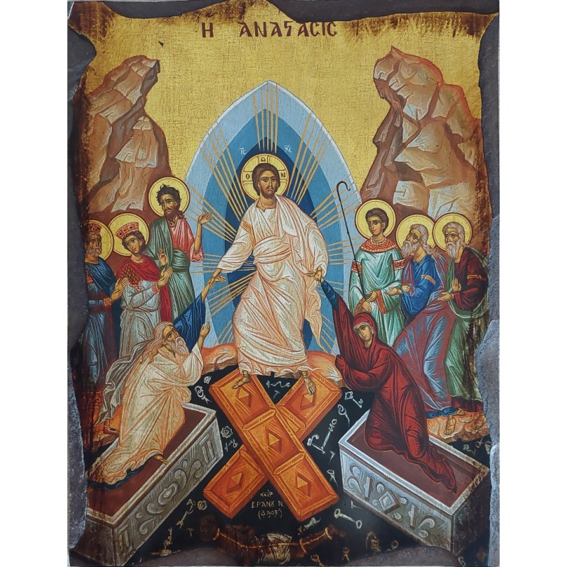 Ústřední postavou této ikony je Kristus sestupující do pekla, který stojí na rozražených dveří pekla. Pomáhá vstát z rakve Adamovi a Evě, jakožto představitelům lidstva a osvobozuje je od smrti. Kristus je oblečen do zlatavého roucha symbolizujícího vítězství nad smrtí.