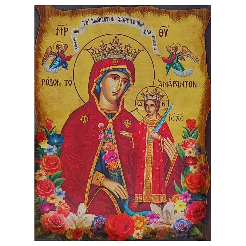 Před námi se rozprostírá ikona "Rodon to amarton," Růže hříšníků, zářící obraz nekonečného soucitu a nebeského milosrdenství. Panna Maria, královna nebes a Země, je zde zachycena v plném mateřském majestátu, držící malého Krista, Krále králů, v náručí.