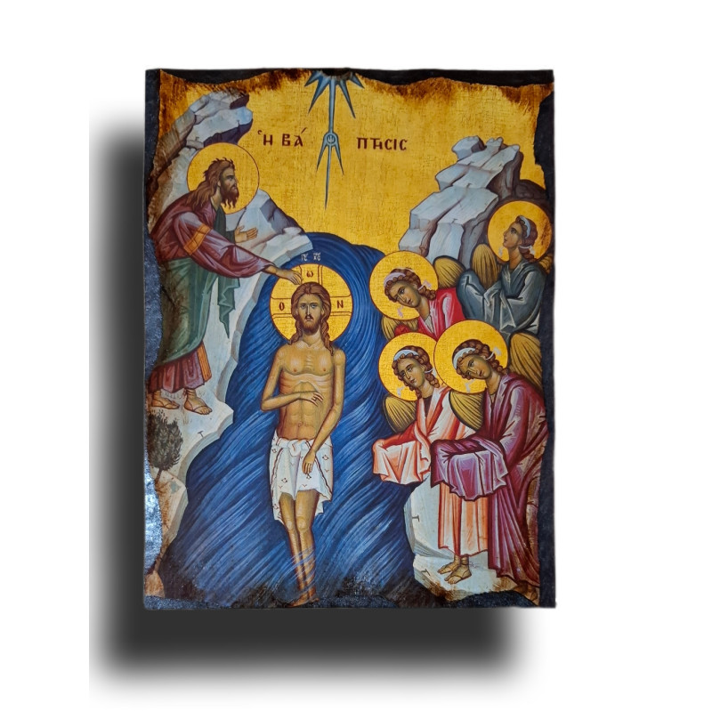 Tato posvátná ikona zachycuje jeden z největších svátků církevního roku – Křest Páně, známý též jako Theofanie nebo Zjevení Páně. Je to okamžik, kdy byl Ježíš pokřtěn Janem Křtitelem v řece Jordán a kdy se poprvé zjevila Nejsvětější Trojice.