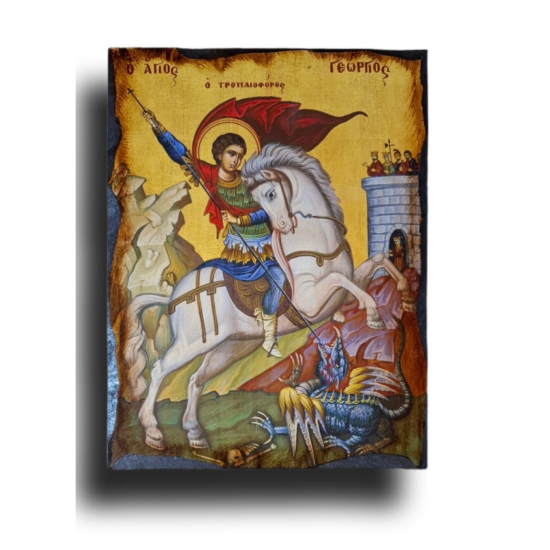 Tato tradiční byzantská ikona znázorňuje svatého Jiřího, jak probodává draka – symbol zla – a zachraňuje dceru krále, která má být obětována. Svatý Jiří je na ikoně zobrazen jako mladý jezdec na bílém koni, s kopím v ruce, v zářivé zbroji, vedený silou Ducha a víry. Nad jeho hlavou se sklání nebeská vítězná korouhev – znamení Kristovy slávy.