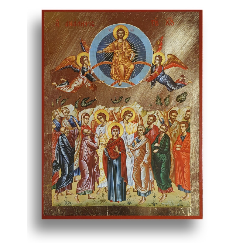 Podrobný popis: Kristus je znázorněn v centru, jak vstupuje do nebe, obklopen anděly, které symbolizují jeho božskou přítomnost a moc. Na zemi pod ním se shromažďují apoštolové a Panna Marie, kteří s úžasem a vděčností sledují jeho vzestup. Ikona je provedena v tradičním byzantském stylu s použitím bohatých barev a zlatého pozadí, které vyzařuje světlo a slávu.
