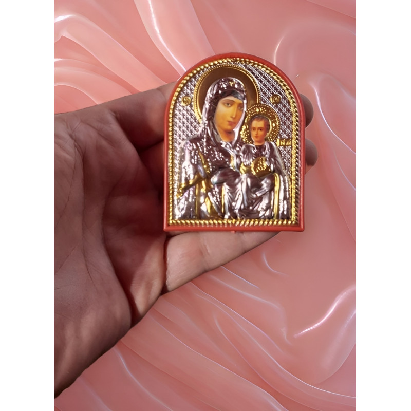 Ikona je vyrobena z kvalitního plastu s detailně propracovaným reliéfem ve zlatém a stříbrném provedení. Na zadní straně je stojánek pro snadné umístění na stůl, polici či domácí oltář. Díky kompaktním rozměrům 7,5 × 6 cm ji lze mít stále nablízku – doma, v kanceláři nebo na cestách.