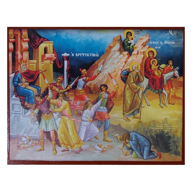 Na ikoně je zobrazen král Herodes, který rozkazuje povraždit v Betlémě všechny děti do dvou let. Za vraždění neviňátek prchá svatá rodina do Egypta. Za skálou na ně hledí sv. Alžběta s malým Janem křtitelem.