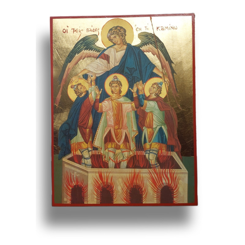 Na ikoně jsou tři mladíci, kteří se odmítli klanět modlám a byli za to Nebúkadnesarem, babylonským králem, hozeni do ohnivé pece. Anděl Páně však mladíky chránil a plameny se jich nedotkly.