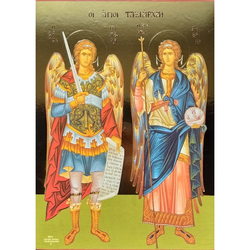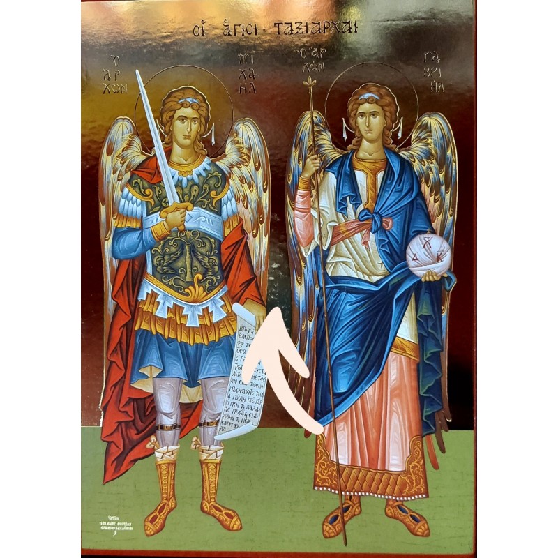 Na ikoně jsou dva archandělé, Michael a Gabriel, ochránci věřících. IKONA JE VE SLEVĚ. PŘI PŘEVOZU Z ŘECKA SE POŠKRÁBALA. VIZ. FOTOGRAFIE.