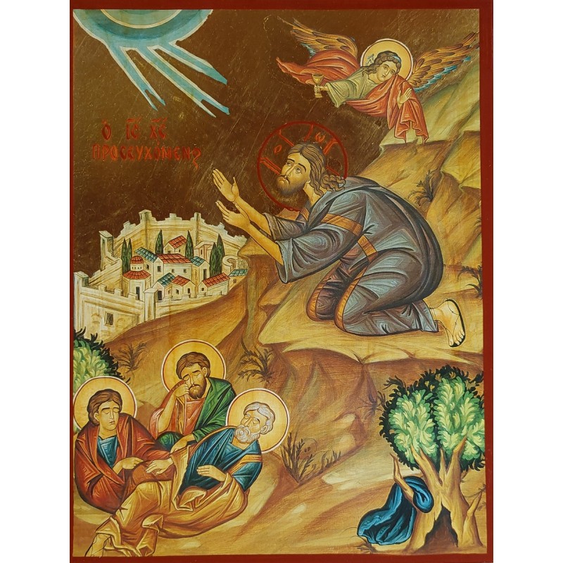 Modlící se Ježíš Kristus v getsemanské zahradě před svým zatčení. Anděl Krista posiluje. V dálce je Jeruzalém, místo dokonání lidské spásy. Spící Petr, Jakub a Jan, představitelé lidství a slabosti, zatímco jejich Spasitel bojuje s úzkostí.