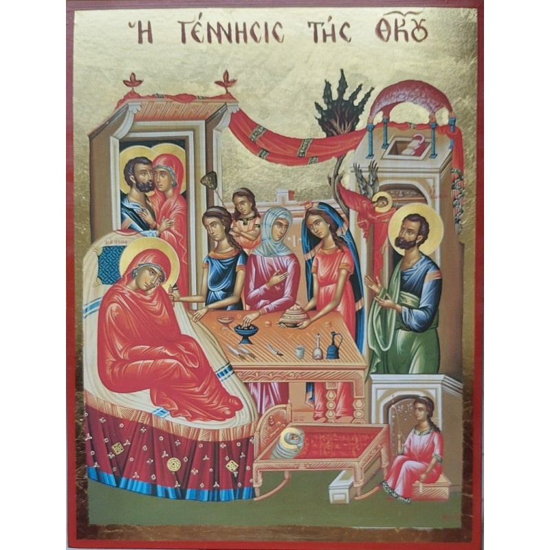 Ikona s názvem 'Narození Panny Marie' je tisková reprodukce tradiční ikony řecké pravoslavné církve. Zobrazuje okamžik narození Panny Marie, obklopené shromážděním postav v nádherném detailu, což je příznačné pro byzantský styl.