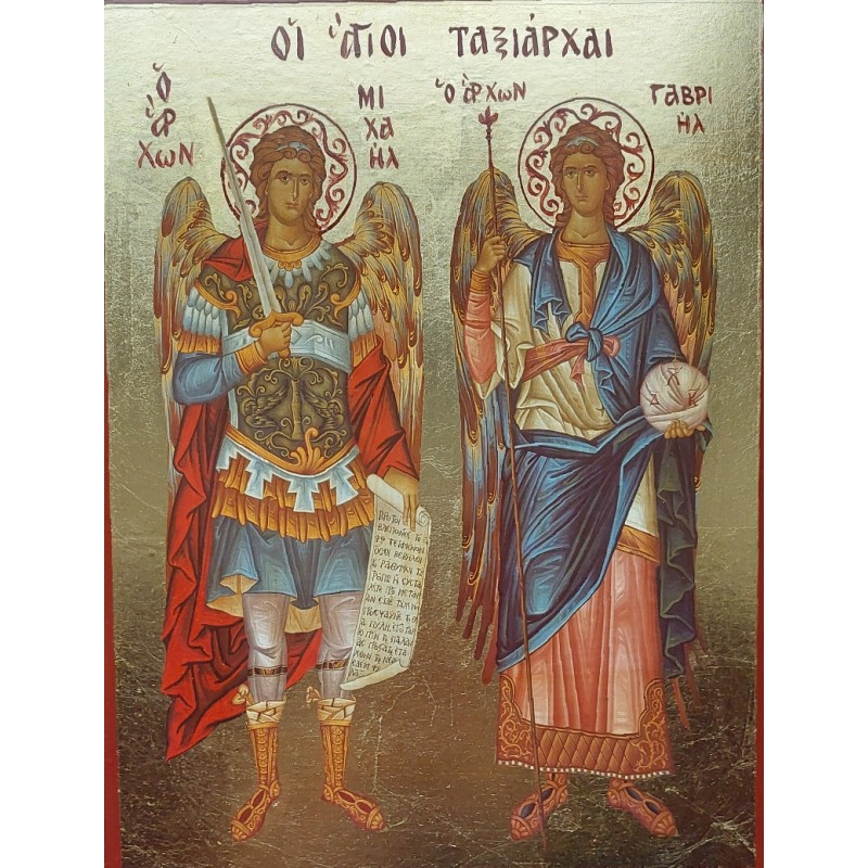 Ikona představuje archanděly Michaela a Gabriela, kteří jsou vytištěni v podobě potisku, což je moderní reprodukční technika umožňující široké šíření těchto duchovních obrazů. Archanděl Michael je zobrazen jako válečník se symbolem moci – mečem, zatímco archanděl Gabriel, známý jako posel Boží, drží ve svých rukou svitek. Oba jsou oblečeni v bohatě zdobených róbách, přičemž jejich postavy jsou umístěny na pozadí zdobeném zlatem, což naznačuje jejich nebeský původ.