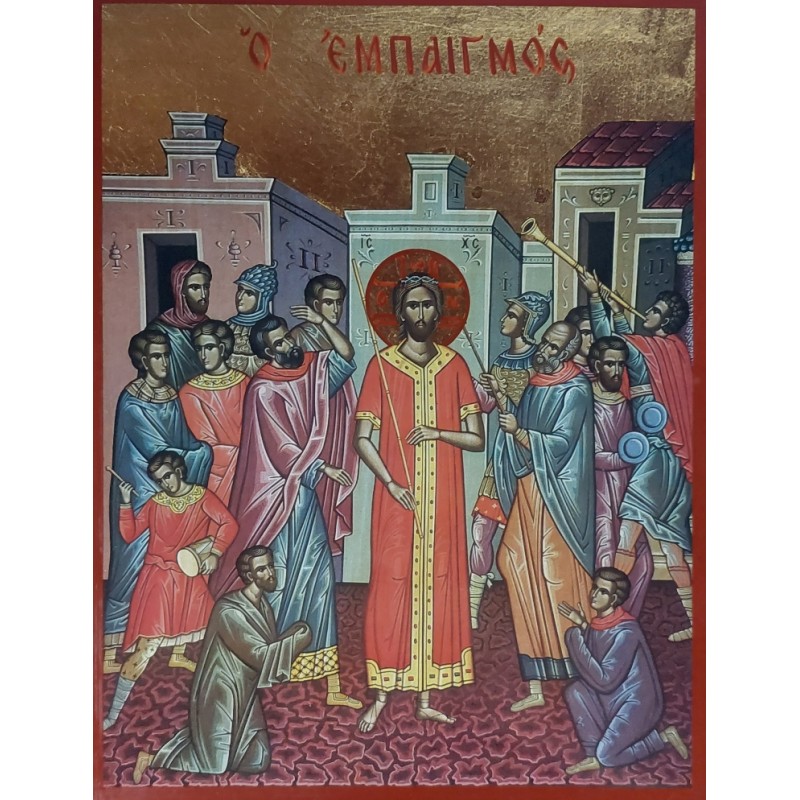 Tato ikona zachycuje hluboce emotivní scénu z křesťanských pašijí, kdy římskí vojáci se posmívají Ježíši Kristu před Jeho ukřižováním. V centru díla stojí postava Ježíše s nimbem, symbolizující svatost a Božskou přítomnost. Okolo něj jsou vojáci a další postavy, které jej posměšně mučí – někteří mu nasazují trnovou korunu, jiní na něj ukazují nebo mu vysmívavě vzdávají falešnou úctu.