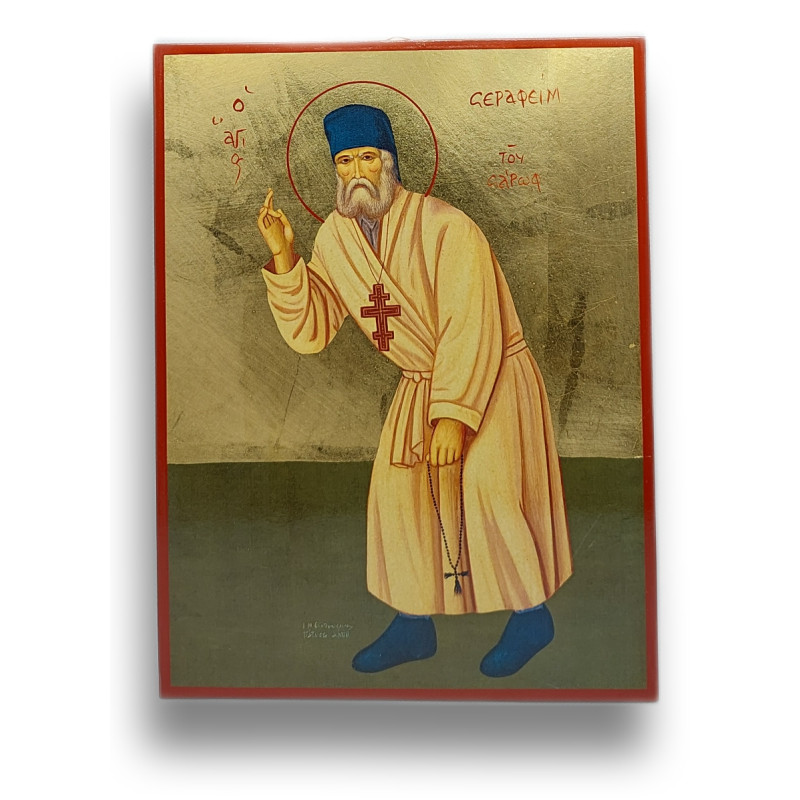Objevte nebeskou krásu a duchovní hloubku s touto ikonou Svatého Serafima Sarovského, ruského mnicha a mystika, známého svými slovy o vnitřním pokoji a spáse. Ikona je pečlivě vytvořena v Řecku, s důrazem na historickou pravdivost a uměleckou hodnotu. Tato 25x19 cm ikona je umístěna na robustním dřevěném podkladu s praktickým ouškem na snadné pověšení. Pozlacený podklad září svatým světlem, což zdůrazňuje duchovní zář svatého Serafima a jeho význam pro pravoslavnou víru.