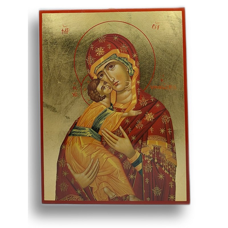Tato ikona Panny Marie, známá jako Katafygy, což v překladu znamená ochránkyně a útočiště, představuje nejčistší lásku a ochranu, kterou Panna Maria poskytuje lidstvu. Vyzařuje mír a pokoru, zatímco něžně drží dítě Ježíše, což v pravoslavné tradici symbolizuje ústřední význam matky v životě každého věřícího. Ručně vyrobená na dřevěném podkladu s pozlaceným pozadím, které rozjasňují již tak působivý obraz, tato ikona je dokonalým dárkem pro náboženské svátky, jako připomínka ochrany a útočiště v každodenním životě, nebo jako centrální kus vašeho domácího oltáře.