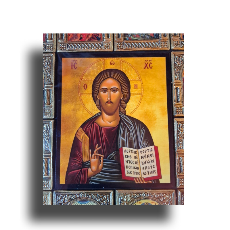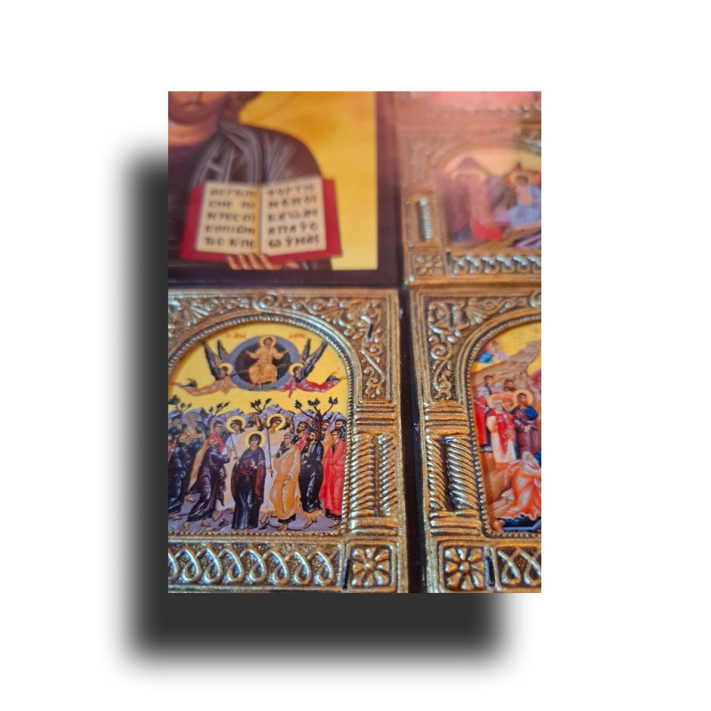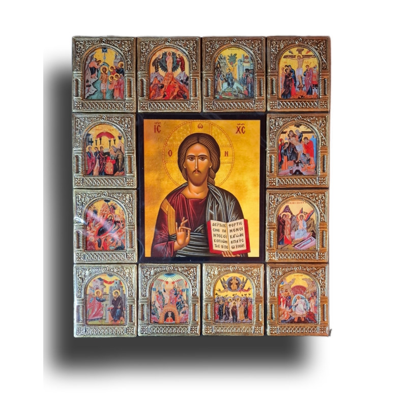 Tato výjimečná vícedílná ikona o rozměrech 28 x 25 cm je zpracována v antickém byzantském stylu. Uprostřed září majestátní postava Krista Pantokratora – Velekněze, který pravicí žehná a v levé ruce drží otevřené evangelium s řeckým textem „Pojďte ke mně všichni, kdo se namáháte...“. Po stranách a kolem Krista se nachází dvanáct menších ikon, které zobrazují klíčové události ze života Ježíše Krista. Celek je zasazen do zdobeného zlatého rámu s bohatým ornamentem. Ikona je při dodání zabalena do ochranné fólie, která slouží pouze k bezpečné přepravě – po rozbalení se odstraní.