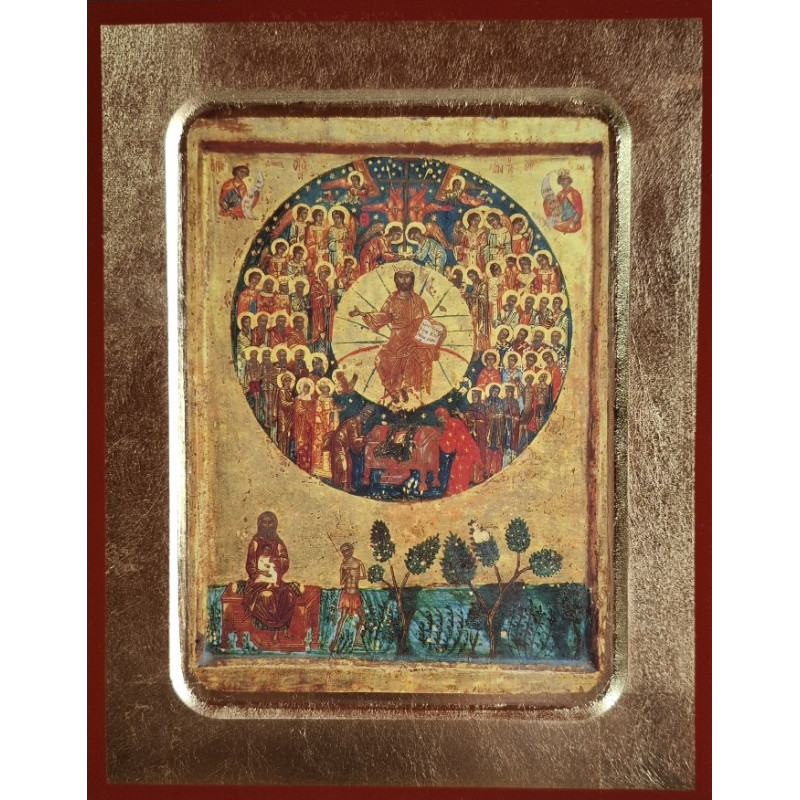 Svatý Justin Popovič o tomto tajemství napsal: „Svatí jsou ti, v nichž žije Kristus. Jsou to živé ikony Boží, které nám ukazují, že nebe není vzdálené místo, ale stav duše sjednocené s Bohem.“ Tato ikona nám připomíná „velký oblak svědků“, který nás obklopuje. Kruhové uspořádání svatých kolem Krista symbolizuje věčnost a dokonalou jednotu – v Božím světle už není rozdělení, jen společná radost a oslava.