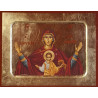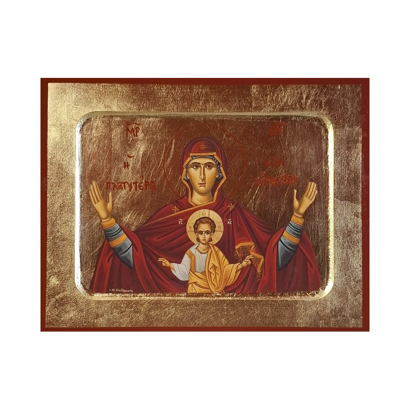 Tato překrásná řecká ikona představuje Přesvatou Bohorodici v klasickém ikonografickém typu zvaném „Širší než nebesa“ (řecky Platytera ton Ouranon, jak uvádí nápis na ikoně). Matka Boží je zde vyobrazena v nejstarším modlitebním postoji Oranta (s pozvednutýma rukama), zatímco v jejím lůně se v posvátném medailonu zjevuje Kristus Emmanuel, který pravou rukou žehná celému světu a v levé drží svitek svatého Evangelia.