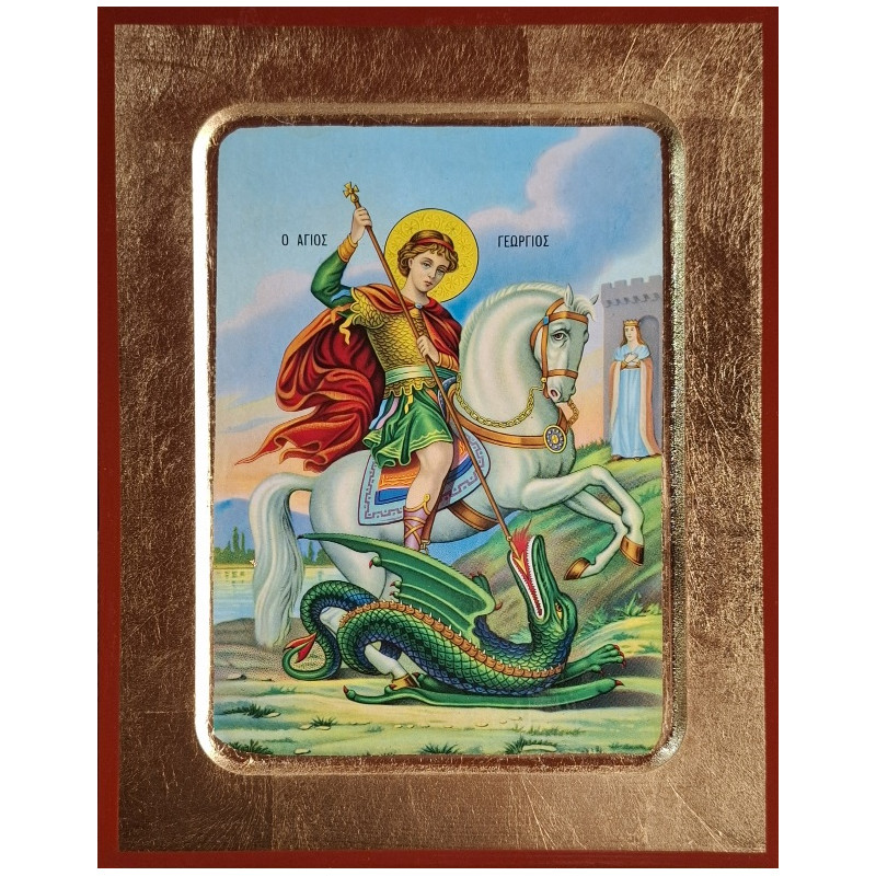 Popis ikony: Tato ikona je věrnou reprodukcí klasického byzantského zobrazení Svatého Jiří (Ο ΑΓΙΟΣ ΓΕΩΡΓΙΟΣ). Světec je zachycen v okamžiku svého nejslavnějšího zázraku – záchrany dcery libyjského krále (v pozadí u hradeb) před hrozivým drakem.