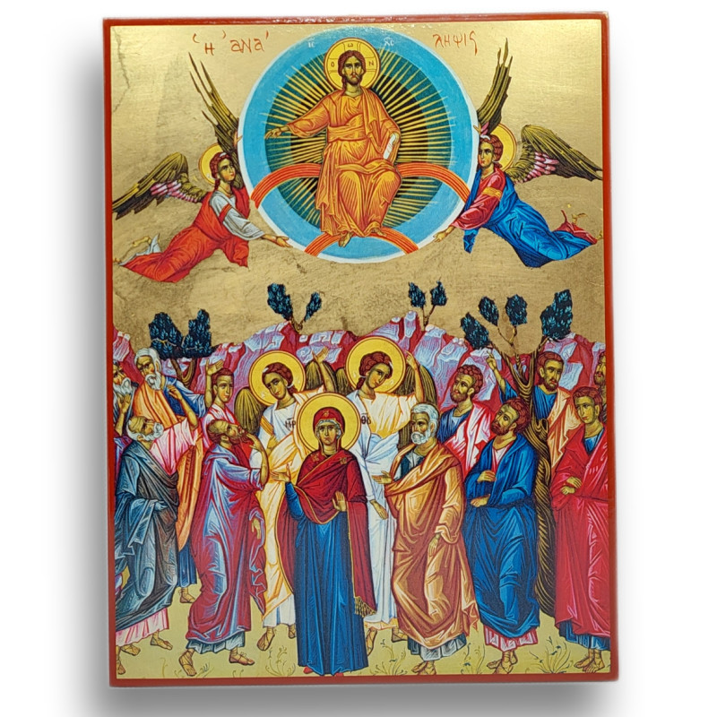 Na ikoně je Kristus nesen anděly vzhůru. Dole je vyobrazená Panna Maria se dvěma anděly, kteří připomínají, že se podobným způsobem Ježíš opět vrátí.