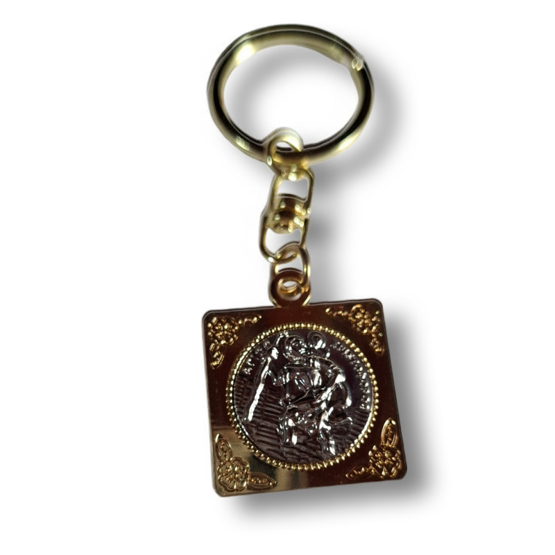 Tento stylový přívěsek na klíče spojuje dvě silné postavy křesťanské tradice: Pannu Marii s Ježíškem – symbol mateřské lásky a přímluvy – a svatého Kryštofa, ochránce všech, kdo jsou na cestách. Medailonek je oboustranný, s precizním kovovým reliéfem a jemnými ornamenty v rozích, které dodávají celku elegantní zlatý lesk.