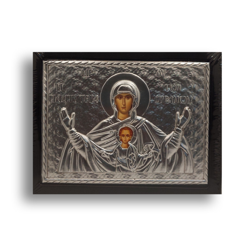 Tato kovová ikona, ztělesňující obraz Panny Marie "Prostornější než nebe", je dílem pravoslavného umění, které bylo vytvořeno s láskou a pečlivostí v Řecku. Zobrazuje Matku Boží v ikonické poze s Ježíšem Kristem, přičemž její titul "Prostornější než nebe" vyjadřuje její důležitost a úctu v křesťanském světě. Detailní zpracování kovu podle byzantských metod dodává ikoně pocit hloubky a duchovní intenzity. Ikona o rozměrech 24x19 cm je zasazena na stabilní dřevěný podklad MDF a je opatřena závěsem pro snadné zavěšení. Je to dokonalá reprezentace umělecké a duchovní tradice, která by se měla stát centrálním bodem jakéhokoliv prostoru určeného pro modlitbu nebo zamyšlení.