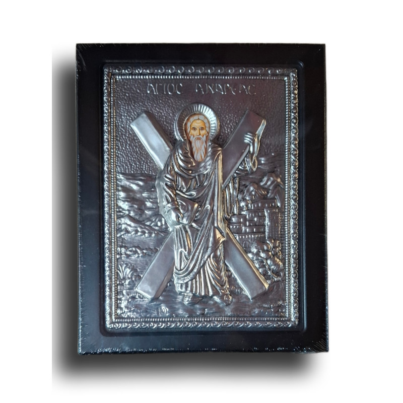Tato krásná kovová ikona zobrazuje svatého apoštola Ondřeje Prvopovolaného, bratra svatého Petra a jednoho z prvních, kdo následovali Krista.