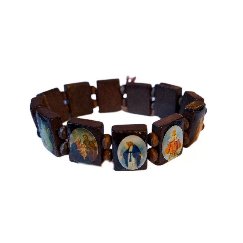 Tradiční dřevěný náramek v hnědém provedení s barevnými obrázky známých katolických světců, Panny Marie, Ježíše a andělů. Každý dřevěný dílek (cca 13 mm) nese malovaný motiv – tichou připomínku víry, ochrany a nebeské blízkosti.