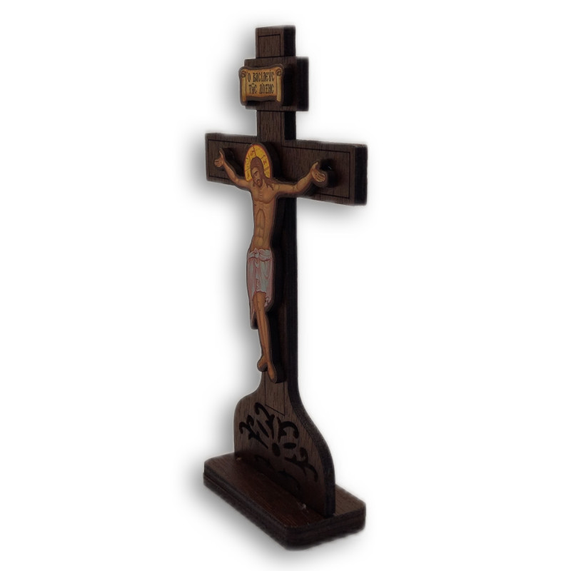 Tento pravoslavný kříž, zpracovaný ve výrazném ruském stylu s podstavcem, je výjimečný svou velikostí 10 X 17 Cm, který je ideální pro umístění na stůl nebo oltář. Jeho ruční zpracování a klasické umělecké detaily jsou typické pro tradiční ruskou ikonografii a přinášejí do každého prostoru autenticitu a duchovní hloubku.