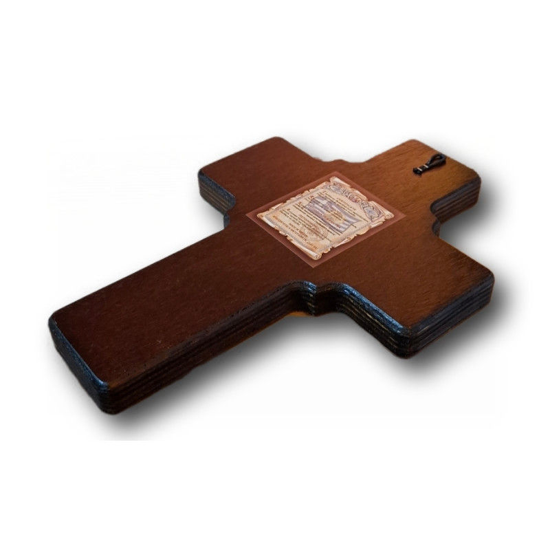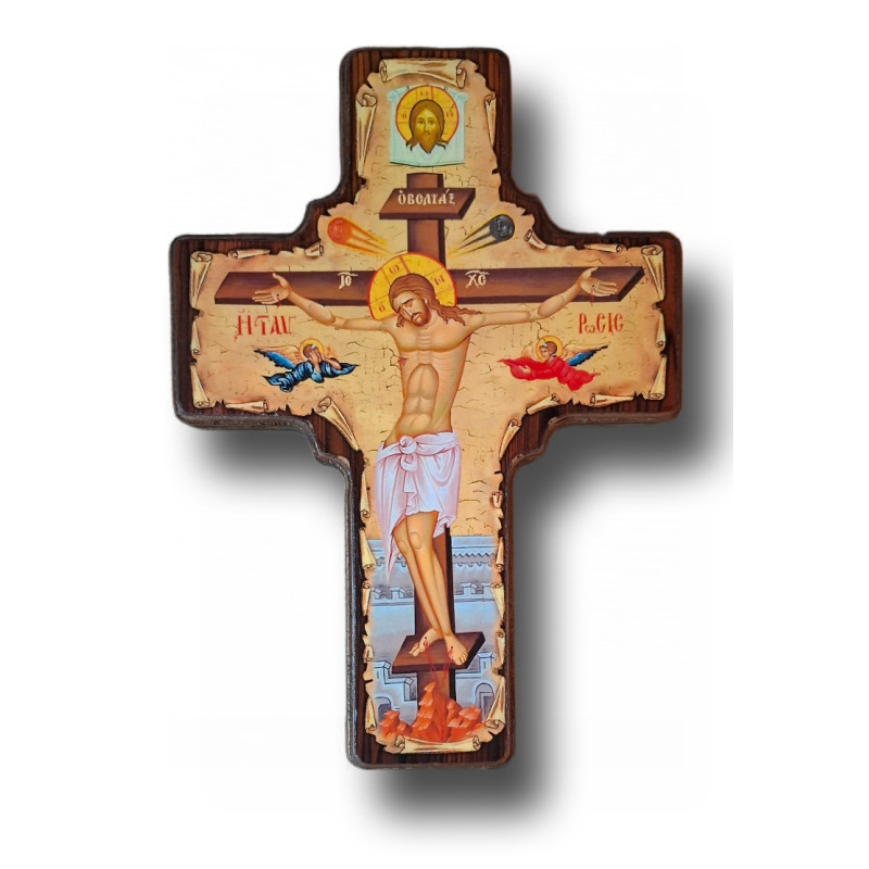 Tento tradičně zpracovaný dřevěný kříž s ikonou Ukřižování Páně v byzantském stylu je připraven k zavěšení na stěnu a obsahuje i certifikát pravosti. Kristus je vyobrazen s mírným náklonem hlavy – symbolem pokory a dobrovolné oběti. Nad ním je nápis „IC XC“ (Ježíš Kristus) a „Ο ΒΑΣΙΛΕΥΣ ΤΗΣ ΔΟΞΗΣ“ – „Král Slávy“, jak bývá tradičně napsáno na pravoslavných ikonách kříže.