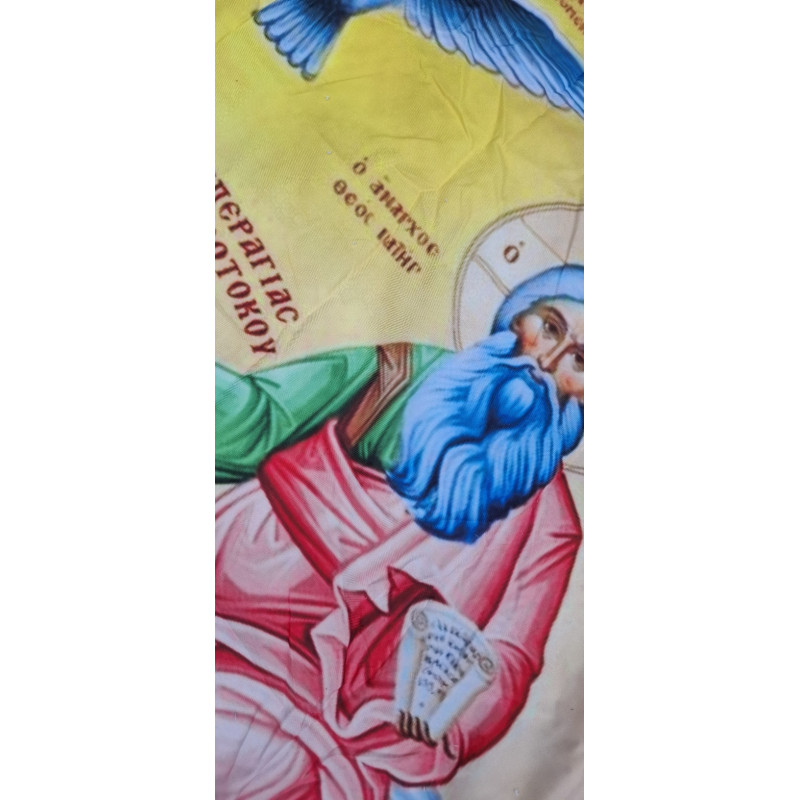 Fotografie byla pořízena na zemi, a proto může zobrazovat přehyby, nerovnosti nebo mírné rozostření, které nejsou součástí samotného produktu. Při běžném pohledu a zavěšení tapiserie působí jasně, živě a detailně, v plné kráse ikonografického stylu.