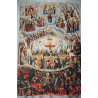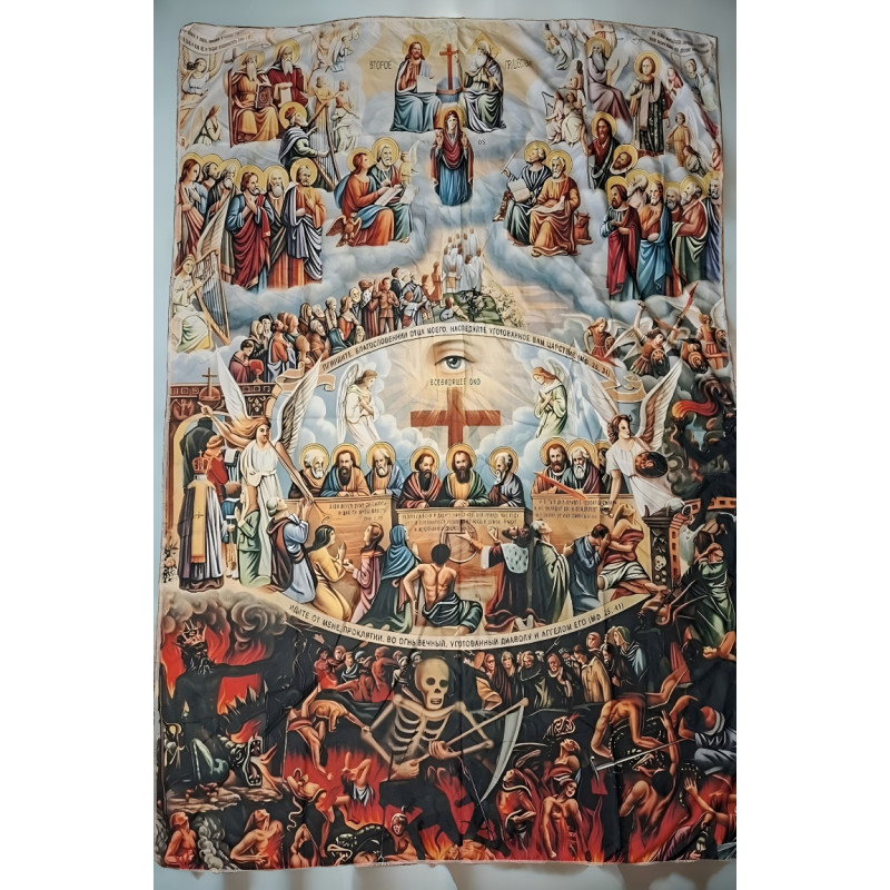Tato tapiserie zachycuje jeden z nejmocnějších motivů křesťanské víry – Poslední soud. Vznešené zobrazení věčnosti, v němž se setkávají nebe a země, světlo a temnota, spravedlnost a milosrdenství. Uprostřed dějin stojí Kříž – osa času i prostoru, znamení vykoupení, které rozhoduje o osudu každé duše.