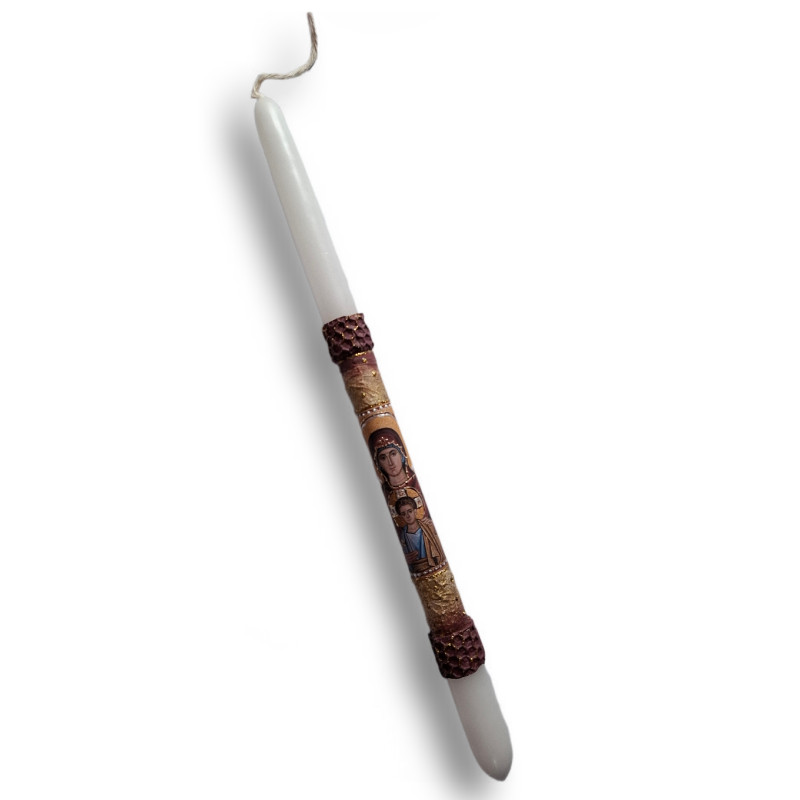 Tato elegantní svíce vyniká jemným uměleckým zpracováním a tradičními prvky pravoslavné ikonografie. Střed svíce zdobí ikona Bohorodičky s Kristem – hluboký symbol ochrany, něhy a duchovní přítomnosti. Zlaté a vínové tóny s perleťovým zdobením vytvářejí slavnostní dojem, zatímco reliéfní detaily podtrhují výjimečný charakter této svíce.