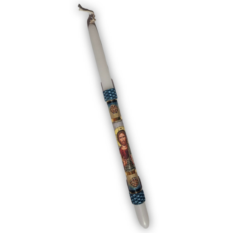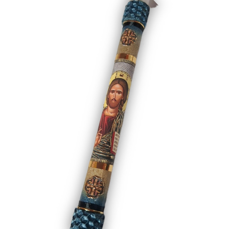 Tato výjimečně zdobená svíce v sobě spojuje duchovní symboliku s precizní řemeslnou prací. Dominantou je klasická byzantská ikona Krista Pantokratora – Všemohoucího, požehnávajícího pravicí a držícího evangelium. Motiv je obklopen strukturálními prvky v metalických tónech zlaté, měděné a výrazné modři, které dodávají svíci slavnostní a uctivý vzhled.
