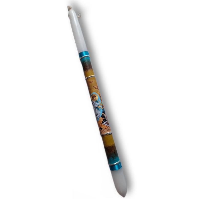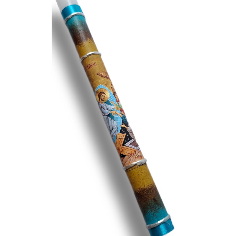 Tato nádherná svíce vyniká bohatou ornamentikou a jemnými detaily ve stylu pravoslavné ikonografie. Centrálním motivem je Kristus sestupující do podsvětí – slavný obraz Vzkříšení, jenž přináší světlo do temnoty. Okraje svíce zdobí zářivé metalické pásky v tyrkysově modré, které elegantně rámují ikonickou výzdobu a vytvářejí harmonický dojem.