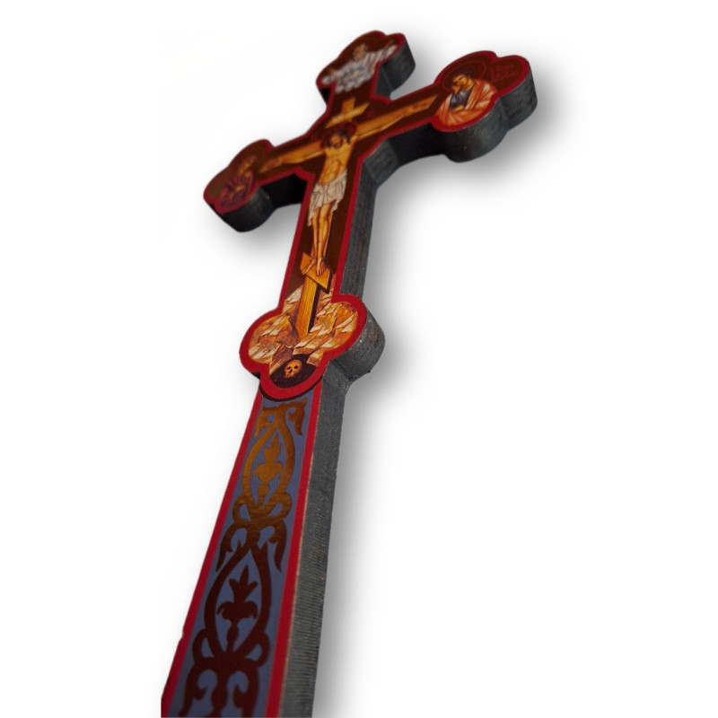 Tento krásný žehnací kříž je ručně vyroben z kvalitního dřeva s pozlaceným pozadím. Uprostřed kříže je vyobrazen ukřižovaný Kristus, doprovázený Pannou Marií, svatým Janem a zobrazením Boha Otce s Duchem Svatým v horní části.
