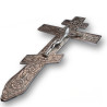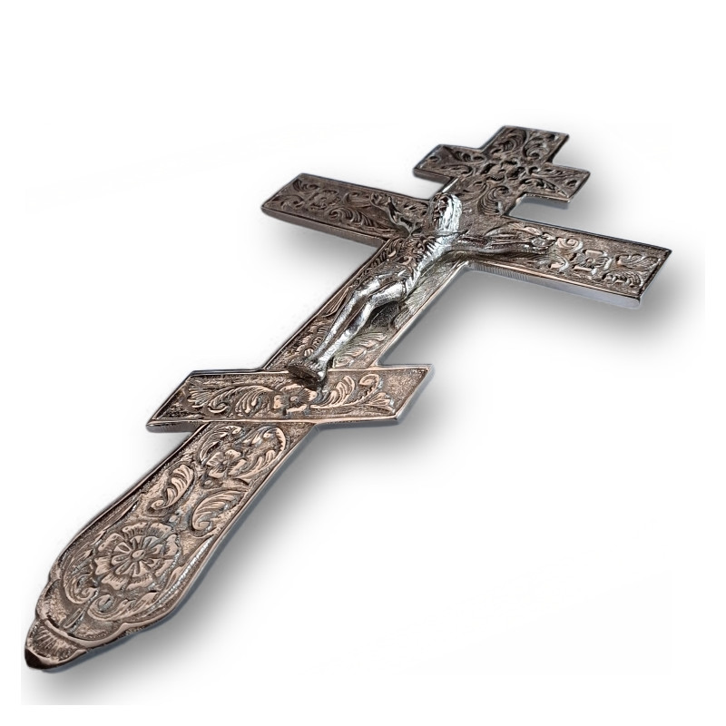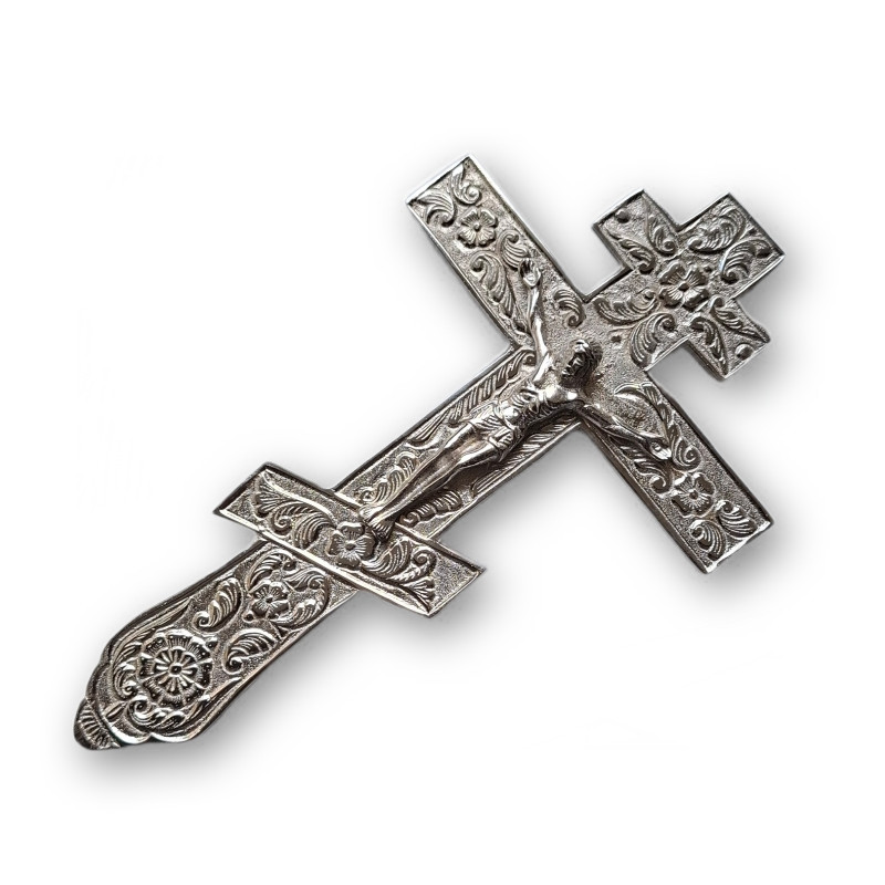 Kříž je vyroben z pevného kovu s bohatým reliéfním zdobením a vystouplou postavou Ukřižovaného Krista. Je těžký a masivní, takže při žehnání působí důstojně a vznešeně. Jemně propracované ornamenty v kombinaci se zlatým tónem podtrhují jeho duchovní i estetickou hodnotu.