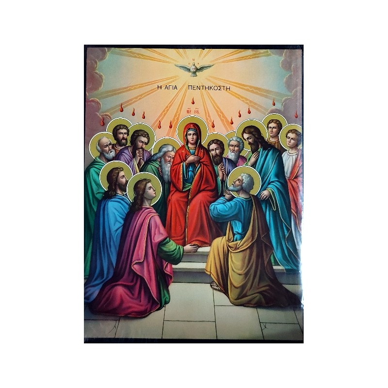 Ikona zobrazující vylití Ducha Svatého o Letnicích. Na ikoně je Panna Maria se svatými apoštoly.