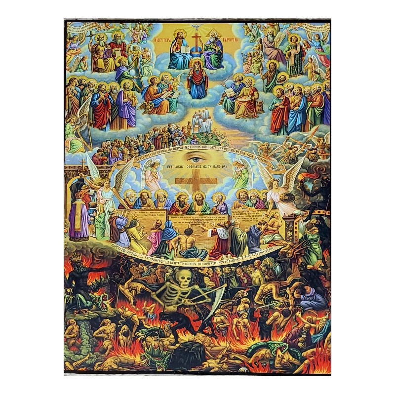 Na ikoně jsou také zobrazeny různé události, jako například soud nad Adamem a Evou, poslední souboj mezi archandělem Michaelem a Luciferem nebo vzkříšení mrtvých.