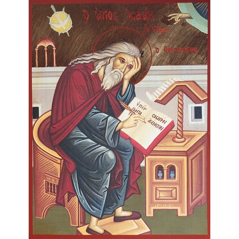 Podrobný popis: Ikona zobrazuje svatého Izáka v okamžiku duchovního osvícení, s perem v ruce, jak skládá své teologické spisy. Jeho pozornost je upřena k nebesům, což symbolizuje jeho vytrvalou hledání duchovní pravdy. Svatý Izák je zobrazen v tradičním monastickém oděvu, a ikona je provedena ve stylu, který odráží hlubokou spiritualitu a historii pravoslavné církve.