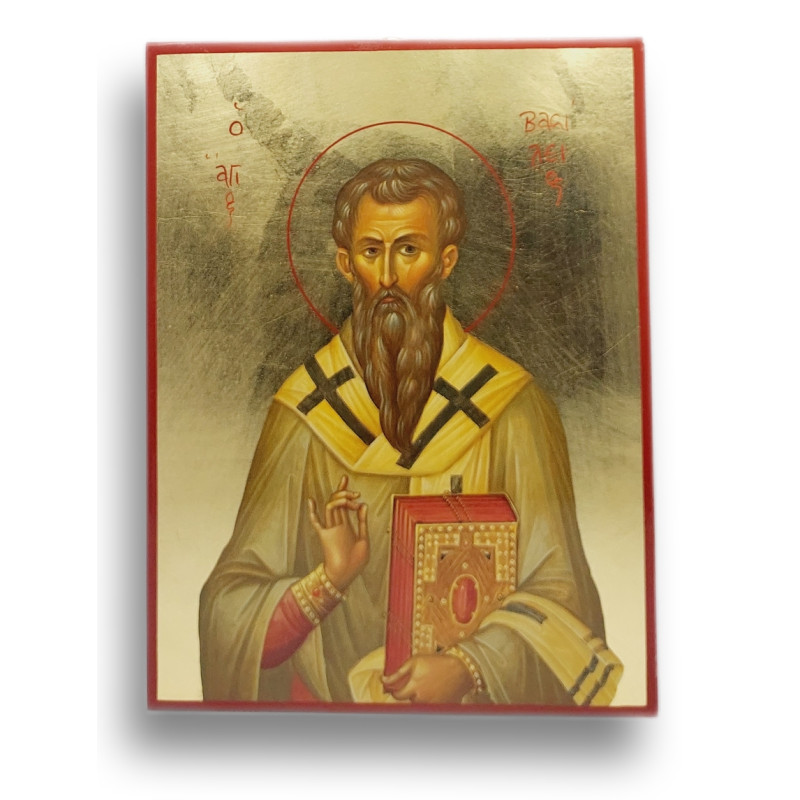 Svatý Basileus Veliký, známý v pravoslavné tradici jako Basileios ho Mega, byl biskupem v kappadocké Cézareji a je považován za jednoho z čtyř velkých východních církevních Otců. Jeho práce a spisy měly zásadní vliv na rané křesťanství, zejména v oblasti monastického života a liturgie. Svatý Basilej je uctíván pro jeho víru, učení a charitativní činy, a ikona s jeho podobiznou slouží jako zdroj inspirace a meditace pro věřící.